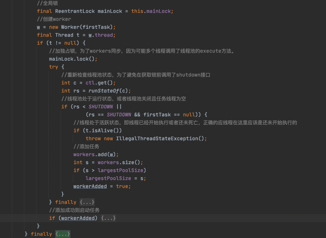 addWorker是添加工作线程的方法,通过Worker内部类封装一个Thread实例维护工作线程的执行,同时根据线程池的状态来判断是否增加相应的任务。