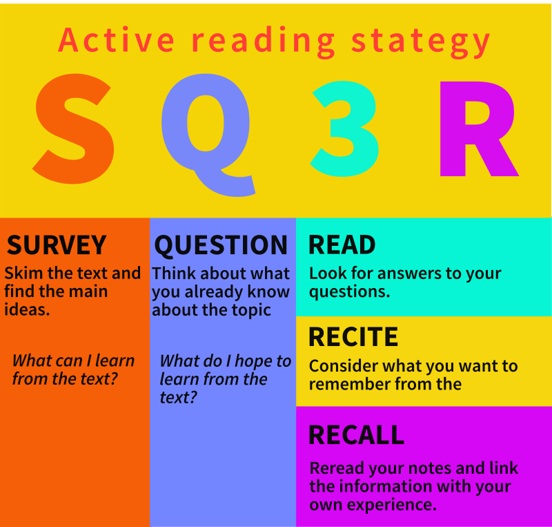 美国教育学家弗朗西斯·P·罗宾逊发明了SQ3R阅读法,就是很好的主动式学习。包括这么几步——调查(Survey)、提问(Question)、阅读(Read)、背诵(Recite)、复习(Review)。