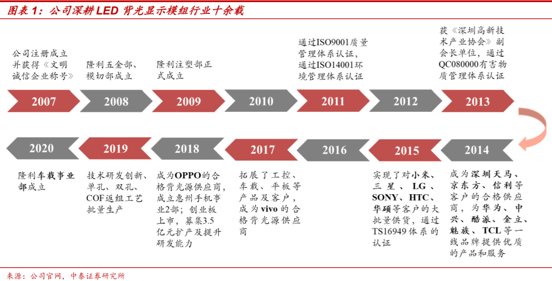 历经十余年发展历程,公司逐渐成长为研发实力强、生产规模大、优质客户多的背光显示模组企业。公司成立于2007年,是专门从事LED背光显示模组开发、生产和销售的国家高新技术企业,其产品广泛用于智能手机、平板电脑、数码相机、车载显示器、医用显示仪、工控显示器等领域。自成立以来,公司始终专注于背光显示模组的研发和生产,依托自主知识产权的核心技术以及多年的生产实践,已逐步发展为国内研发实力较强、生产规模较大的重要背光显示模组企业之一,在中国LED背光行业中处于领先地位。公司创立之初便确立了为客户、为员工及事业伙伴、为社会创造价值的经营理念,技术研发贴近客户需求并进行快速响应,有健全的自主一体化产业链及全面的品质控制体系,拥有长期合作的优质客户及稳固持续的客户合作关系,目前已与京东方、天马、华星光电、深超光电、信利光电、帝晶光电、合力泰、华为、三星、小米、OPPO、vivo等企业建立了长期合作的伙伴关系。