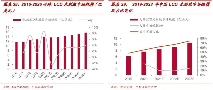 全球LCD光刻胶市场规模超13亿美金,2021-2026年CAGR为2%。根据QY research,全球LCD光刻胶市场稳步上升,2020年达到13.98亿美元,预计2026年达到15.75亿美元。2020-2026年CAGR为2%。未来有望受益于LCD电视的大尺寸化、高清化趋势,LCD面板出货面积不断提升,充分传导至面板光刻胶需求。根据智研咨询数据,预计 2019-2023 年我国 LCD 光刻胶市场规模将会从 40 亿元提升到 69亿元,4 年 CAGR 14.6%,预计国内市场占比也将从2019年47.9%提升到2023年74.6%。