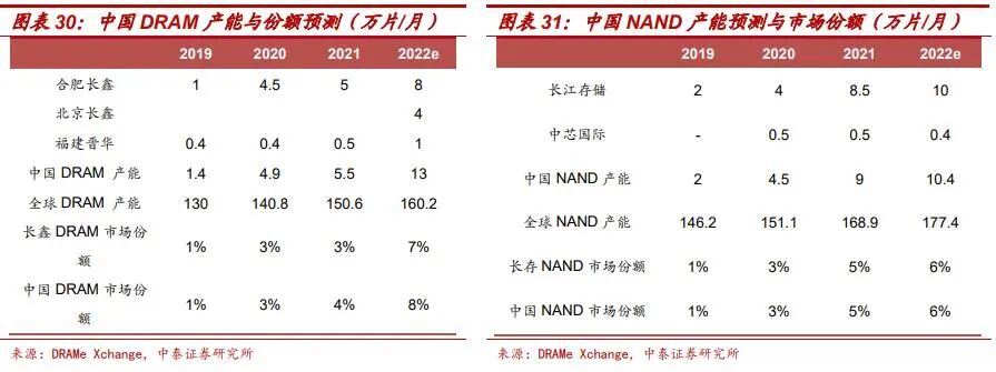 长鑫、长存扩产,本土光刻胶加速导入。受益于居家办公及娱乐需求,终端电子产品与云端服务器出货大增,带动相关存储需求成长,全球存储大厂积极扩产,长鑫、长存也紧抓历史机遇快速扩充能产能。根据DRAMe Xchange数据,随着长鑫长存的扩产,我国DRAM的市场份额有望分别从2021年4%提升到22年8%,NAND市场份额也有望有一定提升。全球DRAM产能预计到22年达到160万片/月,相比21年提升6.4%,全球NAND产能预计到22年达到177.4万片/月,相比21年提升5%。随着全球存储产能的扩容以及中国大陆份额的提升,一方面光刻胶整体需求将提升,另一方面也有利于本土光刻胶导入,加速国产替代进程。