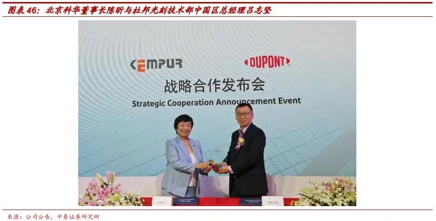 北京科华与杜邦达成战略合作。2021年11月8日,杜邦电子与工业事业部和北京科华宣布开展一项合作计划,为中国集成电路芯片制造商提供高性能光刻材料。杜邦是全球领先的半导体材料供应商,已推出大量荣获认可的光刻产品,包括ArF、KrF和I/G-line光刻胶,以及碳膜涂层 (SOC)、抗反射涂层 (BARC)、先进表面涂层和光刻胶配套试剂。该合作将帮助北京科华快速提供各类高性能光刻材料,助力国内客户的发展。