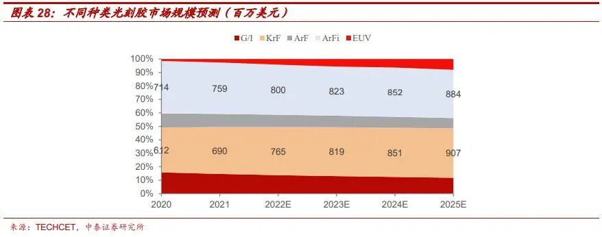 随着全球半导体产业的发展,制造工艺技术节点的不断缩小,KrF和ArF光刻胶市场需求量更大,增速更快,是推动当下光刻胶市场快速增长的主要因素。从市场规模增速来看,EUV光刻胶发展最快,但处于发展初期体量较小,2021年仅约0.51亿美元,预计到2025年达到1.97亿美元,2020-2025CAGR达48.8%;增速第二快的是KrF光刻胶,其2021年全球市场规模为6.9亿美元,预计到2025年达到9.07亿美元,2020-2025年CAGR为8.2%。ArF光刻胶(ArF+ArFi)2021年全球市场规模为9.55亿美元,预计到2025达到10.72亿美元,2020-2025 CAGR为3.5%;较为低端的g/i线光刻胶预计市场规模变化不大,占比缩小。