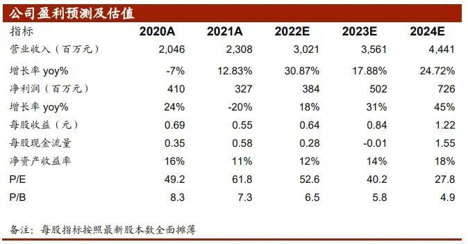 我们预计公司 2022/2023 年营业收入分别为 30.21/35.61 亿元,净利润为 3.84/5.02 亿元,对应估值为 52.6/40.2 倍。2022/2023 年行业可比公司 PE 平均为 55.31/40.38 倍,高于公司对应估值,且公司是大陆光刻胶以及全球特种橡胶助剂龙头,有望引领光刻胶国产替代浪潮,叠加快速发展的可生物降解材料业务打开广阔成长空间,首次覆盖给予“买入”评级。