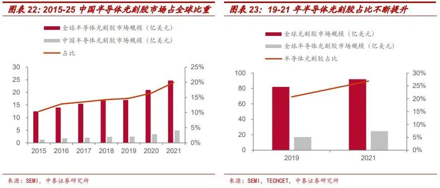 大陆半导体光刻胶增速超全球两倍。分地区看,中国大陆半导体光刻胶市场依旧保持着最快增速,2021年市场规模达到4.93亿美元,较上年同期增长43.69%,超过全年半导体光刻胶增速的两倍;中国占比全球半导体光刻胶市场比重也将从2015年约10.4%提升到2021年接近20%。