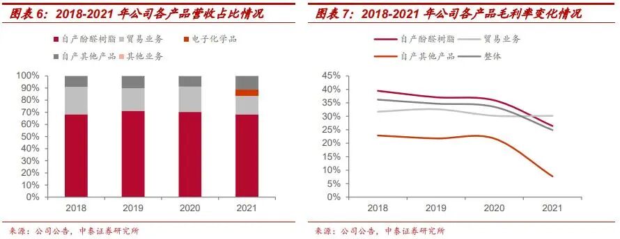分产品来看,2021年自产酚醛树脂产品仍贡献超过67.41%营收和71.51%毛利润。2018-2021年公司自产酚醛树脂营收分别为14.85/15.72/14.38/15.56亿元,同比分别+25.80%/+5.86%/-8.52%/8.21%,分别占公司总营收的68.26%/71.20%/70.27%/67.41%,2021年2月份公司并表北京科华后,公司全年电子化学品实现1.11亿元营收,自产酚醛树脂营收占总营收比重下降了2.86pct,但占营收比重仍超过67%,同时占总体毛利润比重达71.51%,是公司主要营收/利润来源。从盈利能力来看,除贸易业务维持稳定,2018-2021年各产品的毛利率水平均处于下滑趋势,2021年自产酚醛树脂、自产其他产品的毛利率分别同比下降了9.52pct和14.04pct,而新业务电子化学品毛利率为32.54%,未来随着电子化学产能的进一步释放以及规模效应的显现,毛利率有望持续改善。