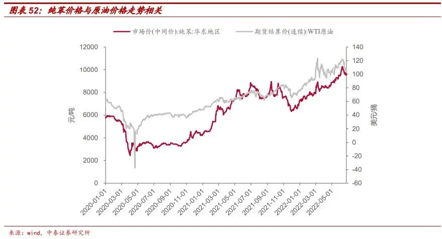 橡胶助剂行业受苯酚等上游原材料价格波动影响。橡胶助剂行业产品种类繁多,所使用的原材料也不同,主要有苯酚、间苯二酚、异丁烯、二异丁烯、甲醛等,根据公司公告,2017年公司生产业务采购的原材料中,苯酚占比最大,达到38%,间苯二酚、异丁烯分别占比25%和20%。苯酚是生产增粘树脂和补强树脂的主要原材料,2020至今,苯酚价格从2020年4月低点4625元/吨上涨到2022年6月约10900元/吨,涨幅高达136%。苯酚价格上涨主要有两方面原因,一方面因为2021年原油价格上涨,导致苯酚的原材料纯苯等大幅上涨,成本向下传导;另一方面,苯酚最主要的下游是双酚A,进而是聚碳酸酯。2021年国内聚碳酸酯的产量提升较多,因此对原料苯酚的需求增长。