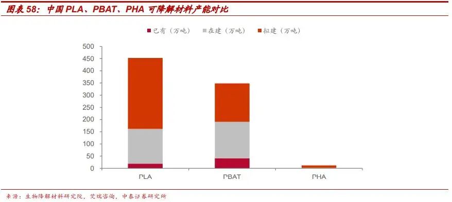 我国PLA原料主要依赖进口,PBAT处于领先地位,产能快速扩张。根据艾瑞咨询数据,目前我国有52家企业在建或拟建PBAT产能,预计未来3-5年,我国可降解材料产能将会达到459万吨。此外,在产能布局上,企业更偏向于技术更先进的PLA方向,其拟建产能大约可达300万吨,可以有效覆盖餐饮市场、农业地膜应用及医用场景下的需求。