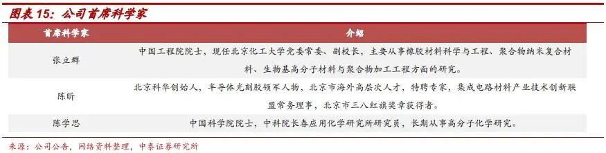 科学家团队实力雄厚,把握行业前沿。公司聘请了张立群、陈学思、陈昕等杰出专家分别担任公司的轮胎橡胶树脂、可生物降解材料、电子材料业务的首席科学家。其中张立群先生是中国工程院院士,现任北京化工大学党委常委、副校长,主要从事橡胶材料等领域的研究。陈学思先生是中国科学院院士,中科院长春应用化学研究所研究员,也是可生物降解材料领域的专家。陈昕女士是北京科华创始人,也是中国半导体光刻胶的领军人物。首席科学家制度有利于公司跟踪行业发展前沿,提升产品与技术水平。