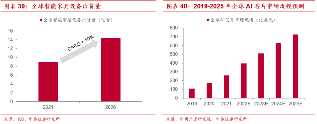 智能家居渗透率提升,全球AloT市场增量可观。AloT应用场景多元,主要涉及智能家居、智慧城市、智能安防以及工业机器人等领域,其中智能家居被认为是在AIoT领域最有价值的场景。根据IDC数据显示,2021年全球智能家居设备出货量超过8.95亿台,同比增长11.7%,并预测全球智能家居设备市场将在未来五年以10%的复合增长率稳步增长,2026年出货量将达14.4亿台。人工智能芯片作为AIoT产业链的上游,随着技术的加速成熟和应用落地,市场需求会进一步增长。根据中商产业研究院数据,2021年人工智能芯片市场规模约为260亿美元,并将在2025年突破700亿美元。