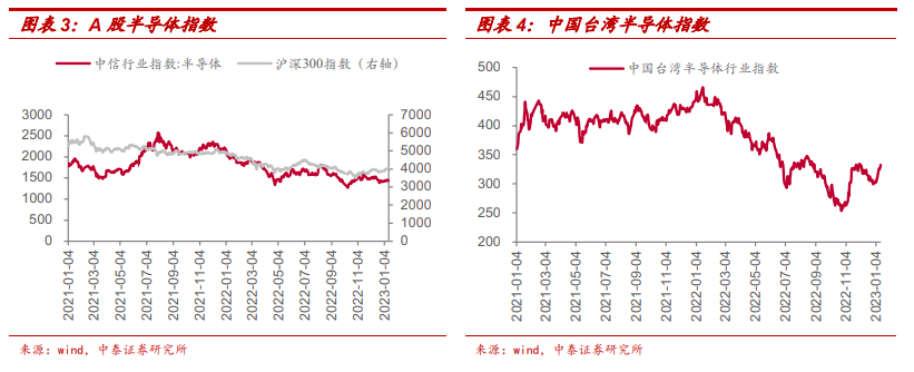 当周(2023/01/09-2023/01/13)费城半导体指数上涨 6.24%,台湾半导体指数周上涨 7.45%。