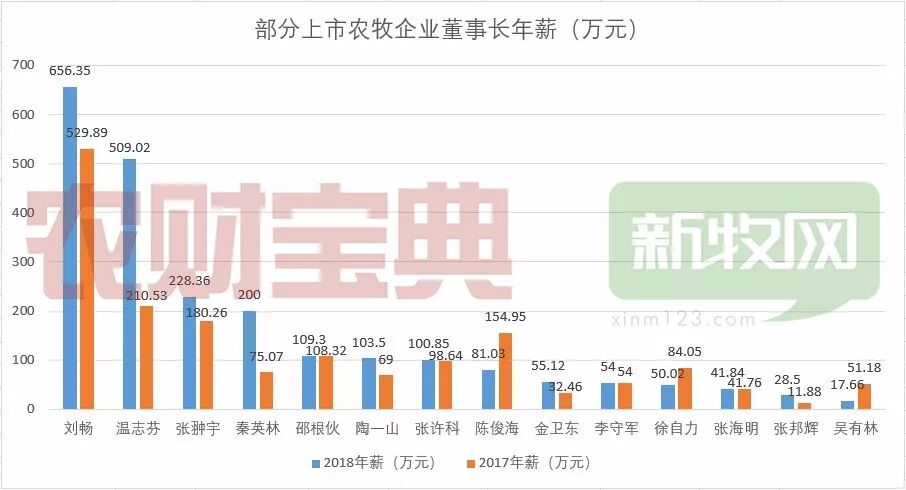 相比2017年,2018年大多数董事长年薪上涨,新希望刘畅虽然持股市值排名第五,但年薪再创新高,达到了656.35万元,排名第一;温氏股份温志芬以509.02万元排名第二;生物股份张翀宇、牧原股份秦英林年薪也超过了200万元。