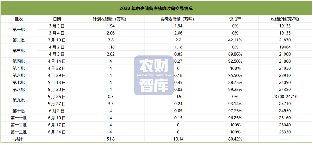 截至目前,2022年我国已启动十三批共计16次中央储备冻猪肉收储,计划收储量合计51.8万吨。据统计,十三批收储实际成交量合计10.14万吨,流拍率高达80.42%。面对猪价的快速上涨,国家发改委近两天更是频频召开会议,约谈大型猪企、屠企、大连商品交易所研究生猪市场保供稳价工作、并表示研究投放猪肉储备。