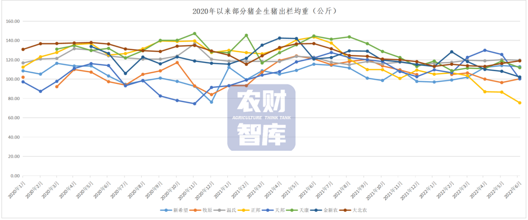 2022年6月,8大上市猪企平均出栏体重为105.2公斤,较上月下降5.5公斤。最高出栏体重为温氏119.62公斤,最低为正邦75.49公斤,仅为上年同期的52.57%。