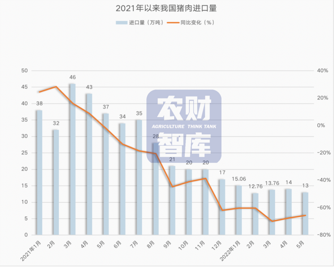 5月猪肉进口量较4月下降1万吨,同比下降65.7%。2022年1-5月,我国累计进口猪肉68万吨,同比减少65.2%。