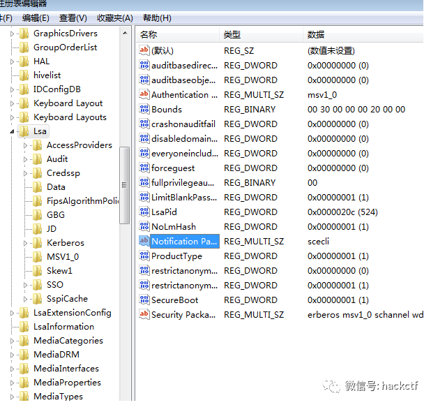 然后把这个dll文件放入system32文件,然后修改注册表,使 hklm\system\currentcontrolset\control\lsa的 notification packages表项包括我们的恶意dll文件,具体命令行操作如下