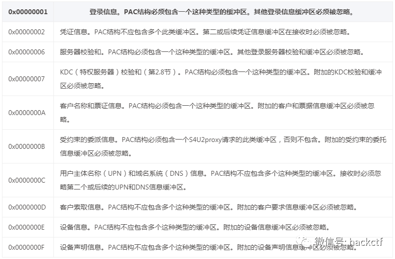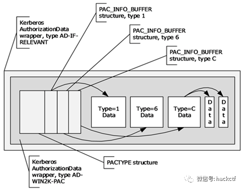 若类型为 AD-IF-RELEVAN ,那么ad-data也是一个 AuthorizationData类型的结构体,也有ad-type 和ad-data.那么这个外壳ad-data的ad-type就是次外壳AD-WIN2K-PAC 了,与 AD-WIN2K-PAC 这个ad-type对应的ad-data就是一段连续空间。这段空间包含一个头部PACTYPE以及若干个PAC_INFO_BUFFER 。
