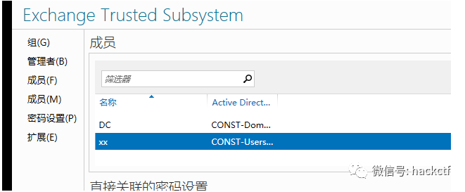其中exchange windows permissions组的用户拥有writeDACL权限, Exchange Trusted Subsystem 是 Exchange Windows Permission 的成员,能继承writedacl权限,有这个权限后就能使用dcsync导出所有用户hash。