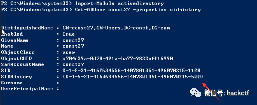 可以发现现在是有SIDHistory属性了。而且末尾的500预示着ADMIN权限
