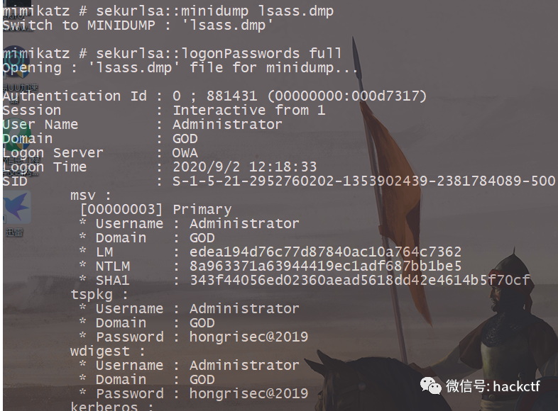 4.上传procdump到目标机,获取到lsass.dmp文件后将其传回本地又mimikatz来dump哈希