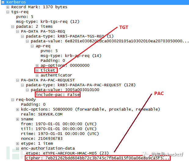 因为我们在AS_REQ时设置include-PAC为false,TGT里就不会包含PAC了。那么我们在TGS_REQ时如何把PAC传递给KDC?只需要把PAC放入req-body即可。