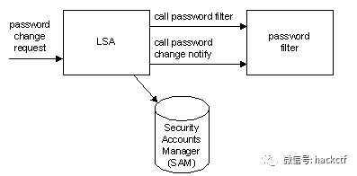 当密码改变请求发生时,LSA会调用Password Filters。每一个password filter会先验证新密码的合法性和复杂度,然后LSA会发出请求已更改的信号。