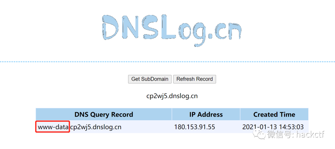 再返回DNSlog平台,点击刷新解析记录按钮,可以发现whoami的执行结果已经拼接成四级域名了: