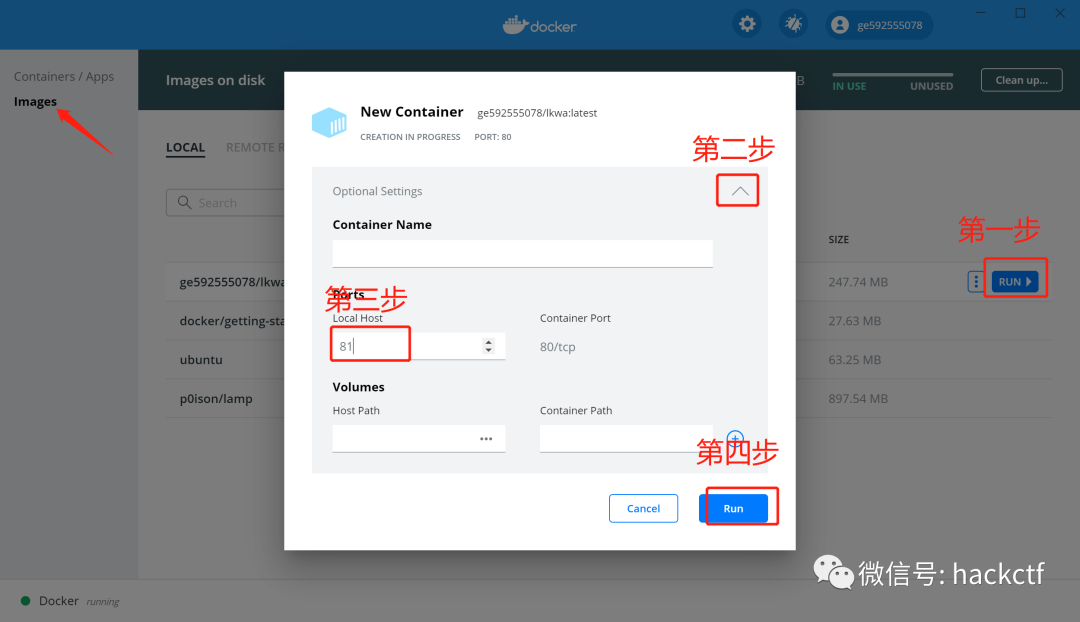 接着打开Docker Desktop按照下图操作运行刚才拉取的环境,并将80端口映射到本地的81端口。