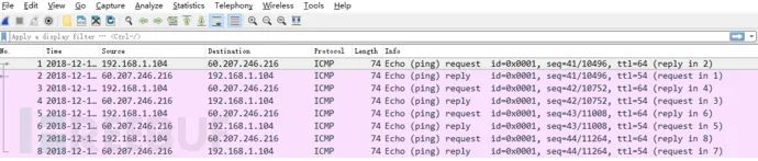 ip host 60.207.246.216 and icmp表示只捕获主机IP为60.207.246.216的ICMP数据包。获取结果如下: