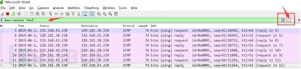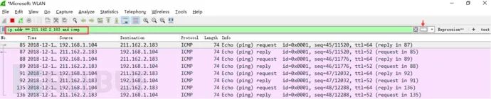 观察上述获取的数据包列表,含有大量的无效数据。这时可以通过设置显示器过滤条件进行提取分析信息。ip.addr == 211.162.2.183 and icmp。并进行过滤。