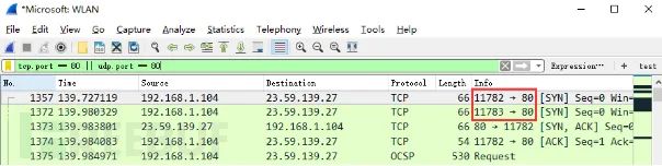 ip.src ==192.168.1.104 显示源地址为192.168.1.104的数据包列表