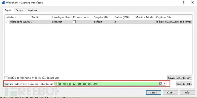 选择菜单栏上Capture -> Option,勾选WLAN网卡(这里需要根据各自电脑网卡使用情况选择,简单的办法可以看使用的IP对应的网卡)。点击Start。启动抓包。