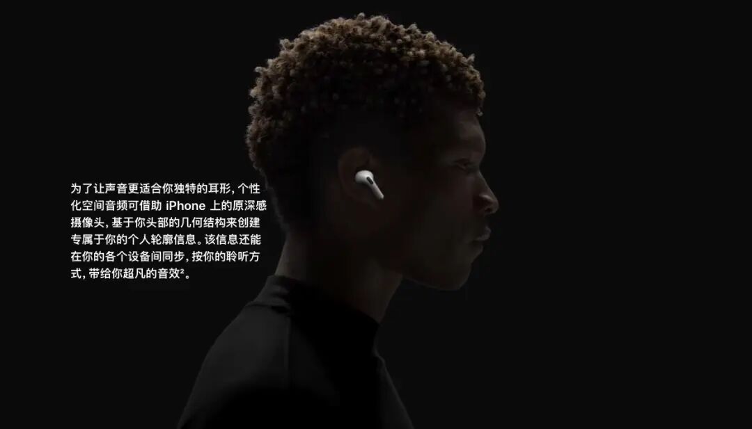音质方面,个性化空间音频可以让 AirPods 提供更具沉浸感的聆听体验。用户可以使用 iPhone 的原深感摄像头创建空间音频个人轮廓信息,获得专为他们精准调校的聆听体验。