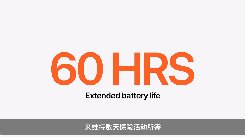 Apple Watch Ultra 拥有所有 Apple Watch 中最出色的电池续航表现,在正常使用条件下最长可达 36 小时。此外,通过全新的低功耗设置,电池续航时间更可延长至最高 60 小时,适合连续多日佩戴使用。