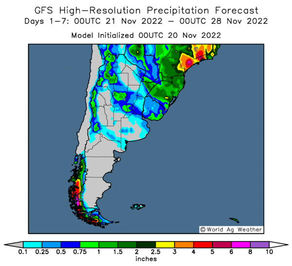 南美南部阿根廷,降雨集中在北部地区,中部地区降雨区域分散,北部局部降雨量可达到2英寸。