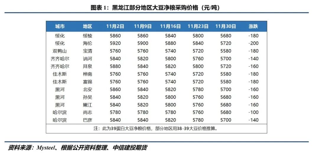 截至11月末,北安直属库、嫩江直属库、敦化官地镇、大杨树镇、莫旗红彦镇等库点第一阶段收购任务已经完成。本周嫩江墨尔根直属库下调收购价格0.02元/斤。国储的陆续退市及收购价格的下调使得前期惜售的农户恐慌情绪增加,纷纷表示愿意以低价出售新豆。多家大型贸易商也不断下调采购价格,以低价探底。本周京粮、华粮、中粮等贸易商的采购价均有所下调,下调幅度在0.02-0.1元/斤。黑龙江各地区的净粮收购价也经历不同程度的下降,月内降幅在100-200元/吨