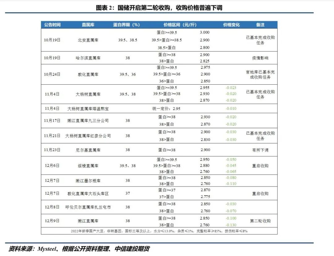 截至11月底,国储多个直属库完成收购任务后相继退市。12月以来,部分库点再次发布收购公告或调价公告,开启“第二轮”收购。但此轮收购中,收购价格较前期均有所下调,下调幅度在0.03-0.13元/斤,不同蛋白层次的收购价差拉大。