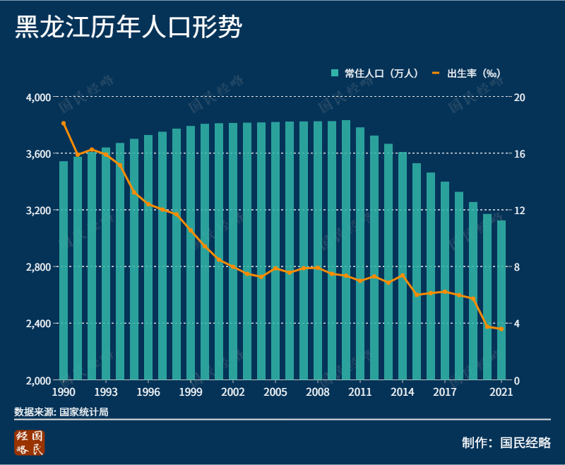 其中,黑龙江是全国人口降幅最大的省份,也是我国少有的连续11人口规模持续萎缩的省份。