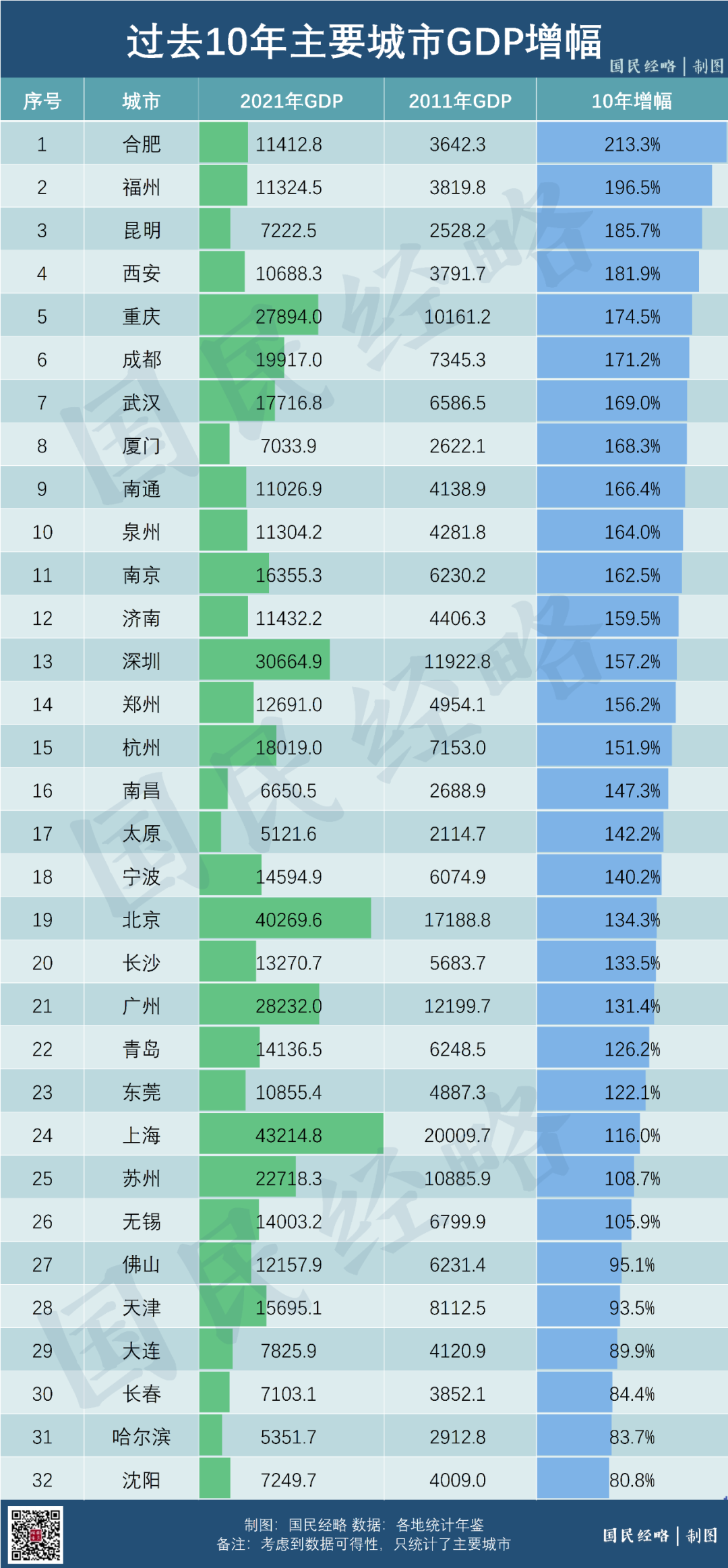 根据《过去10年,谁是全国进步最大的城市》分析,最高的合肥10年增长213%,而同处北方的西安、郑州、济南分别增长181%、156%、159%。