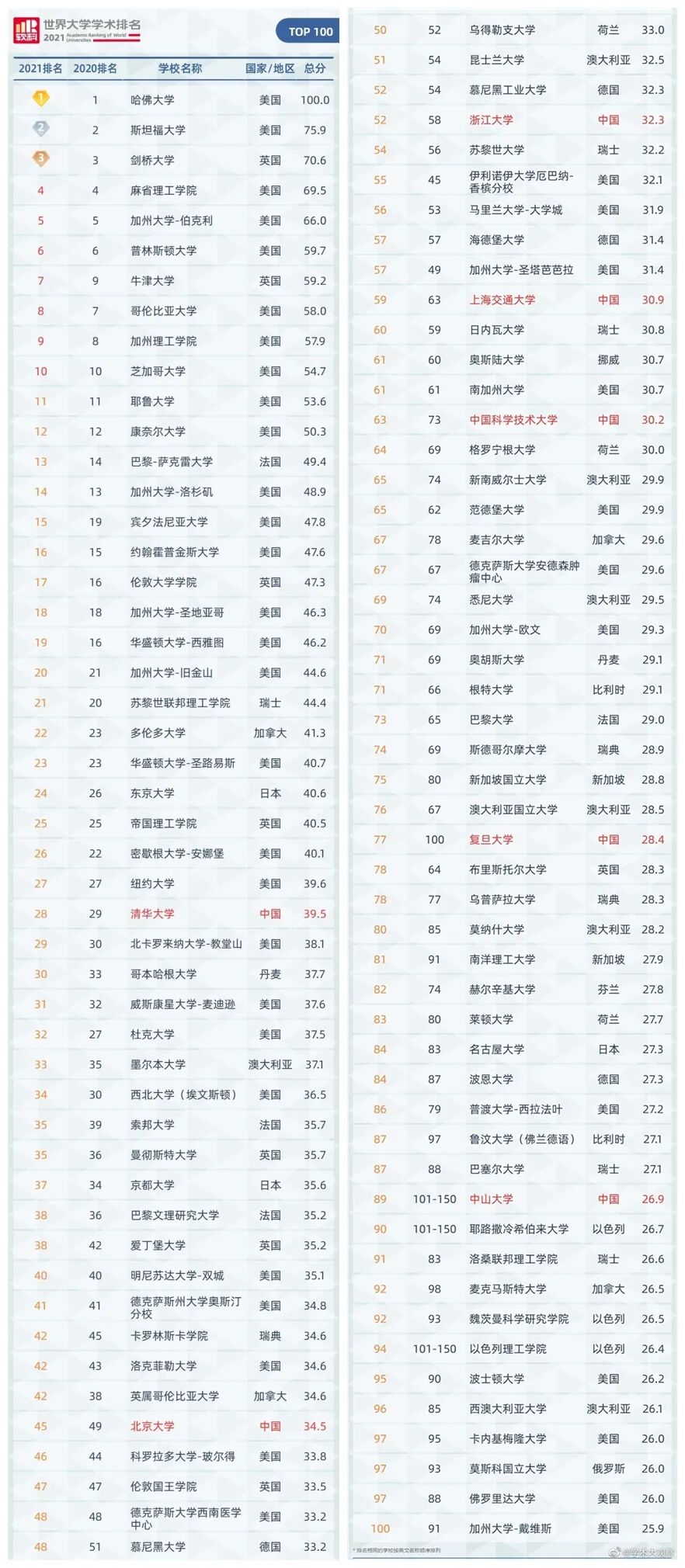 而在TOP100高校中,共有清华大学、北京大学、浙江大学、上海交通大学、中国科学技术大学、复旦大学、中山大学等7所高校入围。(参阅《2022年,中国大学生最多的20个城市》)