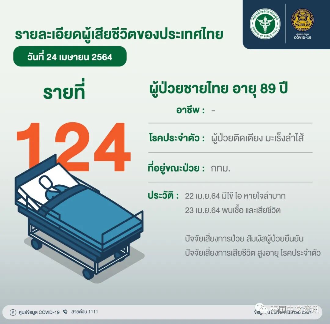 据泰国疫管中心消息,4月24日,泰国新增8例新冠肺炎死亡病例。