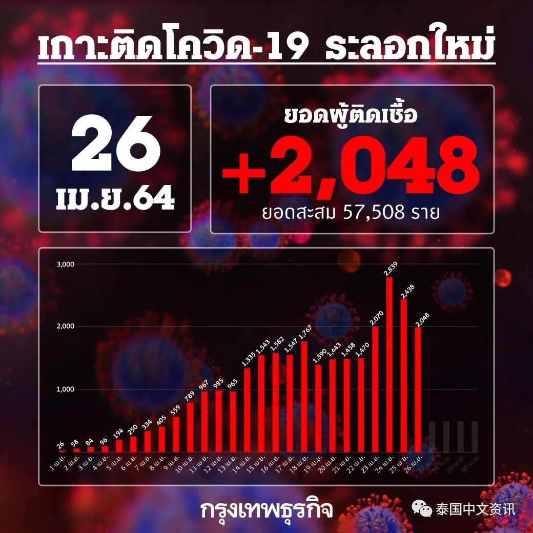 泰国网报道,据泰媒最新消息,4月26日上午07:00泰国卫生部疾控厅发布泰国疫情最新确诊数据,今日泰国新增确诊2048例,其中包括本土确诊2038例、境外输入确诊10例。