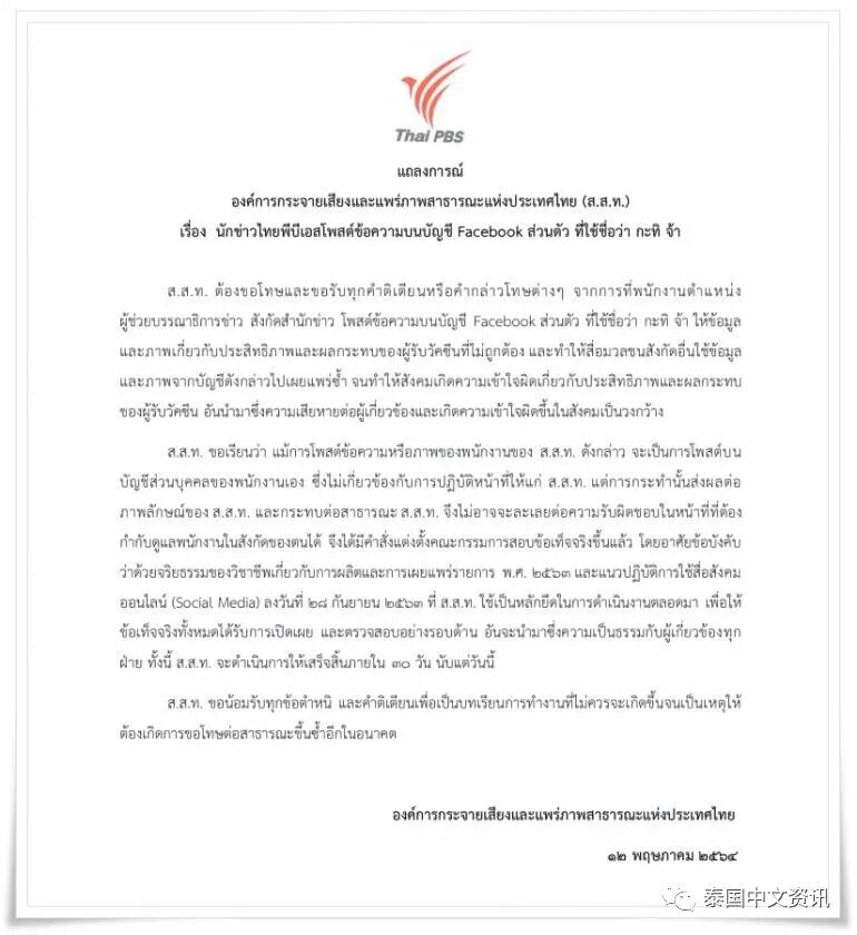 5月12日,泰国公共电视台 (Thai PBS)官方针对此事在平台发文致歉。