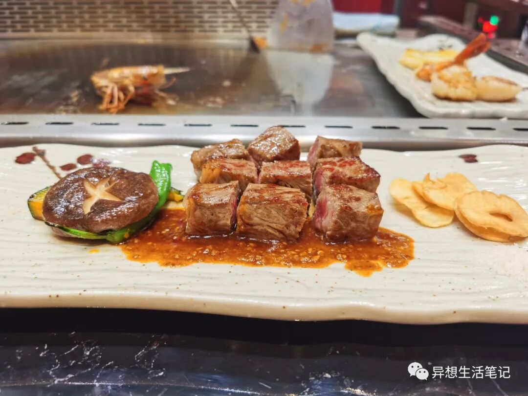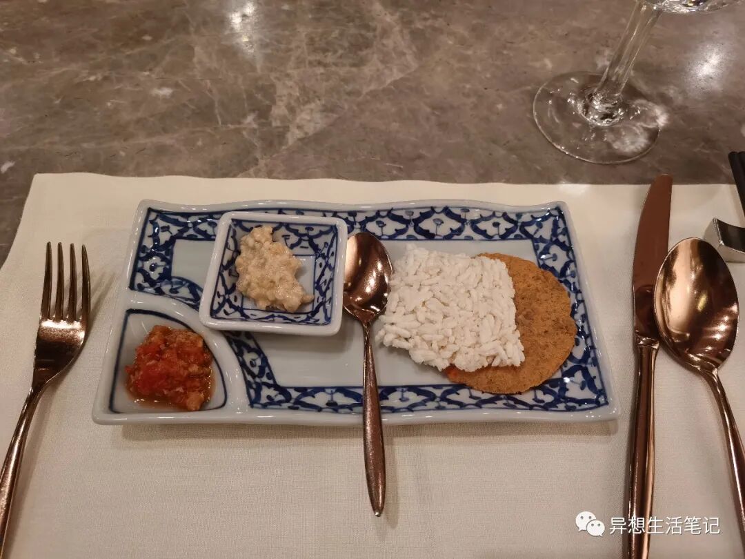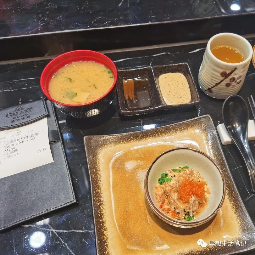 因为方便又好吃,我离开澳门前又去吃了顿晚餐(完美地把风味居抽奖的券用掉了),还闹了个小插曲。那天我买完东西到餐厅已经20:15,而最后一班去关闸的接驳车是21点,担心法餐一道道上来不及吃,我拜托店员帮我快点上菜。菜嗖嗖嗖就全上了,我人生最快的一顿法餐,从前菜到甜品不到半小时吃完,我连最后一口香槟都喝完了。没想到,我到了海关居然体温异常被带去临时隔离的小屋,给我吓坏了。后来才想起我是喝酒喝太急,衣服又穿得多,加上赶路,体温就升高了。还好冷静了一会儿测腋下温度正常顺利通关,有惊无险啊。这家店在悦榕庄,很豪华。我点了三道菜用掉6张百元餐券,略贵,不过是好吃的。当时店里加上我一共就两个人在吃,店员服务极其周到,体验很棒。最惊艳是这道泰南风情的辣烤嫩牛肉巴克豆,牛肉非常嫩,辣得很过瘾又有香茅香气,我一下就吃完了这份肉,超级饱。巴克豆的味道我不太习惯,但这样搭配还挺新奇的。冬阴功汤就是中规中矩的好喝,不太辣,估计是做了改良。我特别喜欢吃泰国米粉,吃泰国菜必点。但因为吃肉喝汤都饱了,米粉我真的吃不太动了。而且它本身分量就很大,建议两个人或以上再点这个粉。米粉是好吃的,唯一问题也是不够辣,我爱配辣椒面吃,但这家只有辣椒酱,差点意思。赠送的前菜很惊艳,类似虾片和锅巴的零嘴,配了两种鸡肉蘸酱,口味新鲜又开胃,我很喜欢~点了个但马M6和牛套餐,mop268,性价比超高。看看这个和牛的纹理和质感,五成熟真•入口即化,除了嫩还是嫩,大口吃肉的感觉太上头了。套餐里还有开胃菜、米饭、味增汤和炒蔬菜,一人食刚刚好。