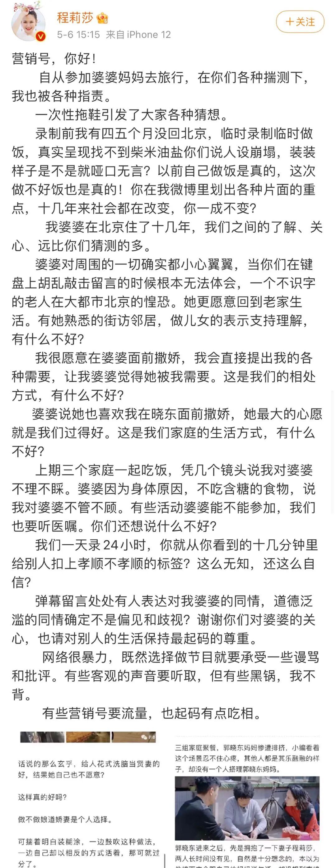 最近《婆婆和妈妈2》正在热播,其中程莉莎和“钢铁直男”郭晓东的“神仙爱情”频上热搜,不过最令我感慨的是她为了婆婆怒怼营销号。
