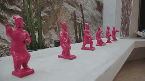 马伯骞的家也是以白、灰为基调,本以为是冷淡风,一不留神却被骚气的荧光粉撞到眼里。他不仅挑了粉色餐椅,连兵马俑摆件也是整整齐齐的艳丽,转头看看多肉和仙人掌,连一朵粉色小花都是搭配心机。不得不说,本来我对荧光粉家居的认知是大张伟那种卡拉ok风,但马伯骞的家却让我发现,一向俗气的颜色,在冷淡风的衬托下竟然有点高级?这一招还挺妙的,少即是多。在大片净色的冷淡风家居里,一点点有迹可循的大胆用色就像布丁上的那层浓郁焦糖,反而会让风格更鲜明。