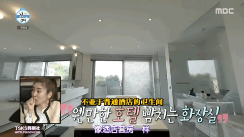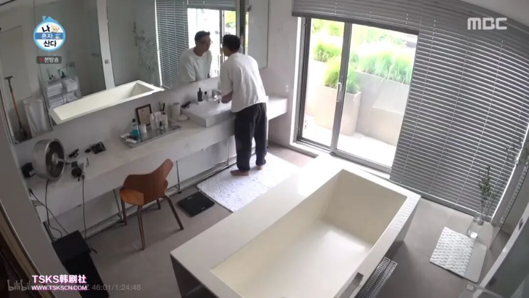 他入了占据半面墙的USM收纳柜,在洒满阳光的窗户底下,白色百搭又显宽敞。洗手台底下也藏了有,不仔细看还发现不了,跟墙面和洗手台完美融合。这就体现出浅色墙面的包容性了。柜子、置物架只要颜色和墙面融为一体,存在感都会大大降低,不会占据视觉空间。按刘亚仁对包豪斯家具的喜爱,选USM当收纳一点都不意外。这是瑞士老牌的模块家具,简洁现代的工业风,用钢管、金属板和小钢球就能自由组合。