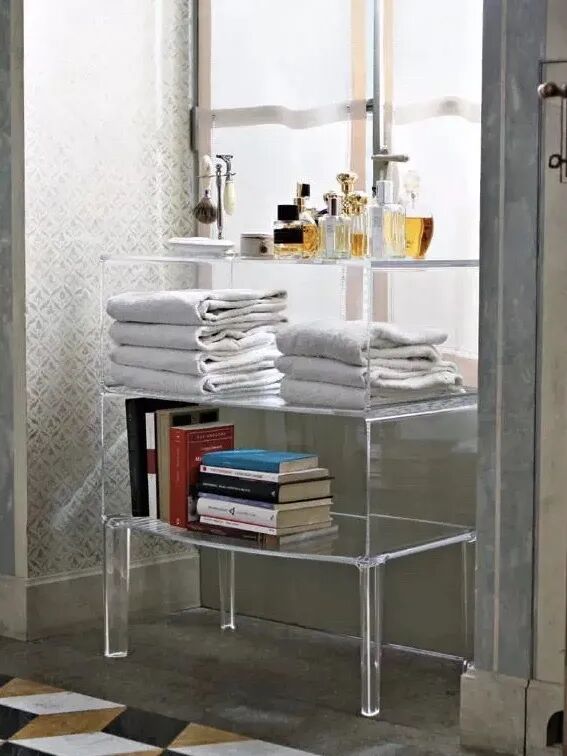 刘亚仁的洗手间通透得让人放松,放了不少东西却不显拥挤,早上起来,他都会坐在这里发好久的呆。空间大是一方面,会挑家具也是真的。他做了一面超大的镜子,还专门选了Kartell Ghost Buster收纳柜当毛巾架,透明圆滑的亚克力干净整洁,跟大名鼎鼎的幽灵椅师出同门,都是为了那份心无挂碍的自在透明。即使层层叠了毛巾杂物,一眼望去还是清凉视野,比木质或不锈钢的柜子更清爽。对比马伯骞在西安老家的小屋,整个洗手间都是木质墙面和柜子,通透感就差了些,会有点压迫感。放在小卫生间里,通透感就更重要了。比起封闭式的柜子,透明材质会在视觉上“扩容”。也可以考虑镜柜,我家浴室有一个,既能收纳,又能显大,还蛮推荐的。