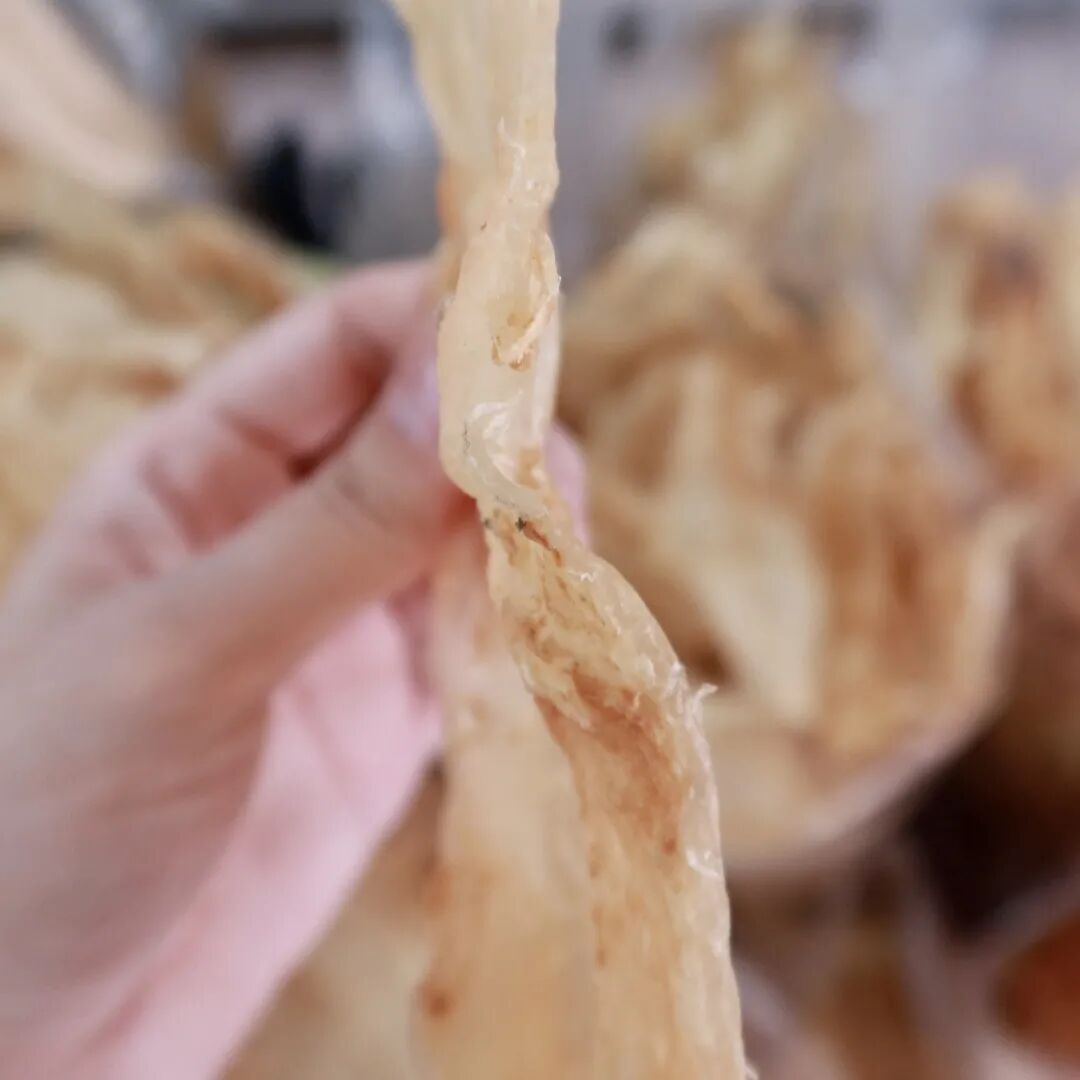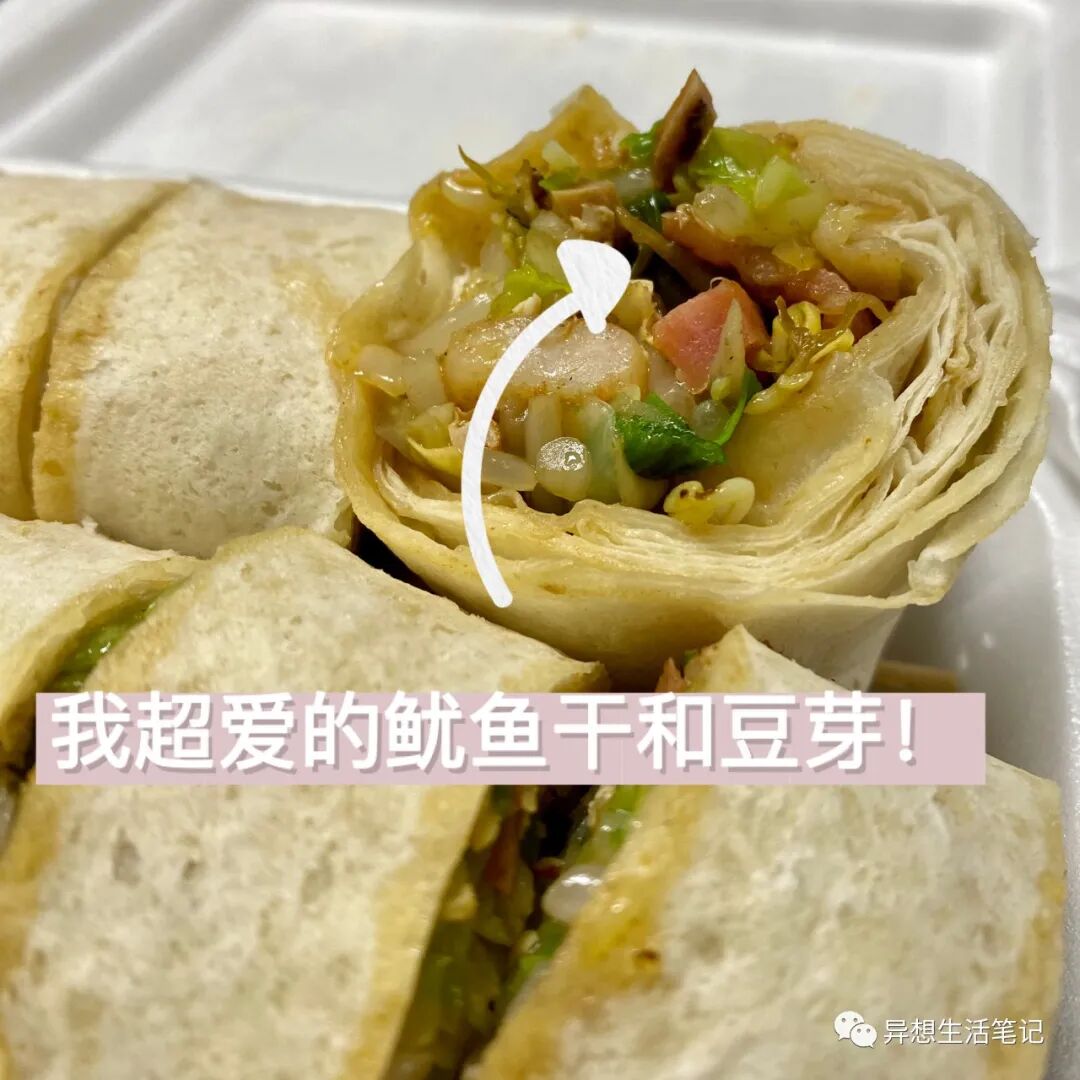 咸薄饼里有炒菜芽、包菜、鱿鱼干、火腿,好吃的秘密是火力够猛和秘制调味酱汁。薄饼皮和芽菜吸满汁水,一口一个薄饼,酱汁在嘴里迸发,芽菜在舌头上跳舞,我又活了。看薄饼摊主人包薄饼蛮治愈的,一放一卷一切,行云流水。